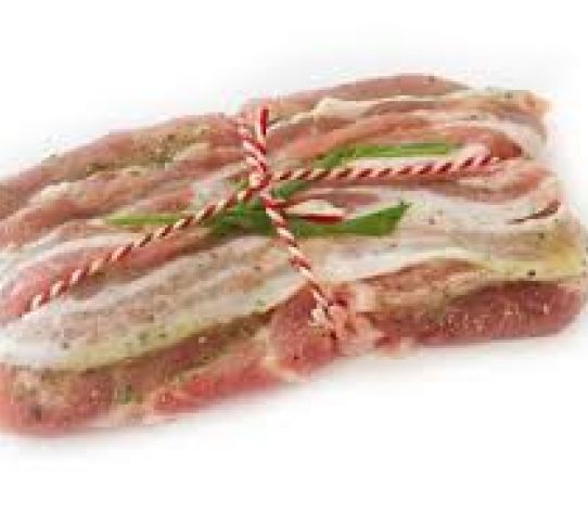 Een varkensfilet lapje omwikkeld met gerookt ontbijtspek en licht gekruid.